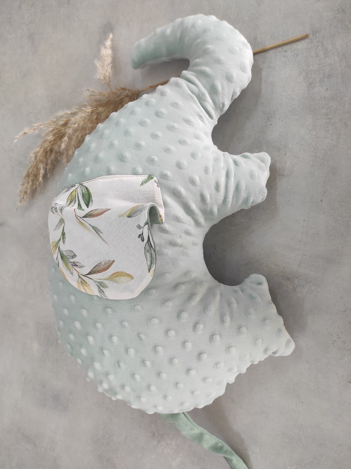 Ένα διακοσμητικό μαξιλάρι με ιδιαίτερη χρηστική αξία είναι ο ελέφαντας της συλλογής μας, ραμμένο στο χέρι από το αγαπημένο σας χρώμα βελουτέ minky και με το σχέδιο που θα επιλέξετε για τα μεγάλα του αυτιά, θα στολίσει το κρεβατάκι σας με ιδιαίτερο τρόπο. Στηρίξτε το κεφαλάκι του μωρού σας ανάμεσα στα πόδια του ελέφαντα και θα το κρατήσει σταθερό όπου κι αν βρίσκεστε… Η ουρίτσα του είναι ένα χαριτωμένο μασητικό για την περίοδο της οδοντοφυΐας που θα το κρατήσει απασχολημένο.